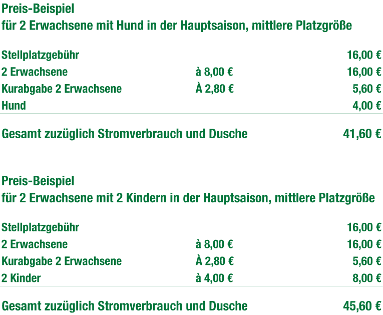 Preise pro Übernachtung:20,00 € (Duschen frei), Mindestmietdauer 3 Übernachtungen