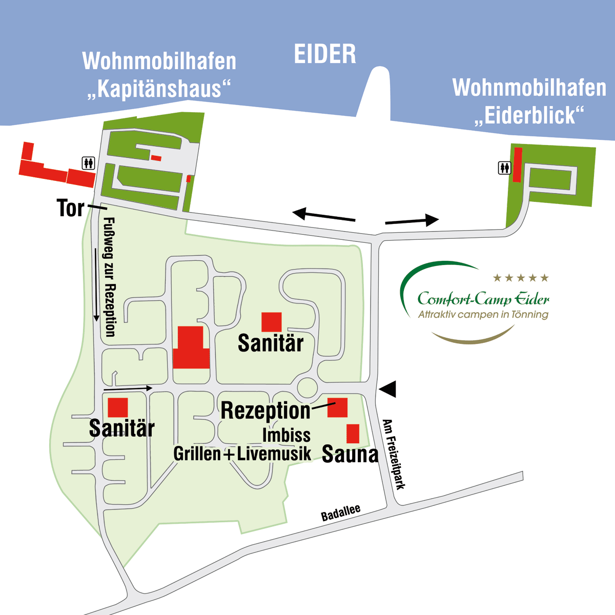 Das Comfort-Camp Eider ist ein familienfreundlicher Campingpark mit 2 Wohnmobilhäfen in Tönning auf der Nordseehalbinsel Eiderstedt. Von hier aus können Sie den Nationalpark Wattenmeer erkunden, im historischen Hafen von Tönning bummeln oder an den Stränden von St. Peter-Ording baden gehen.